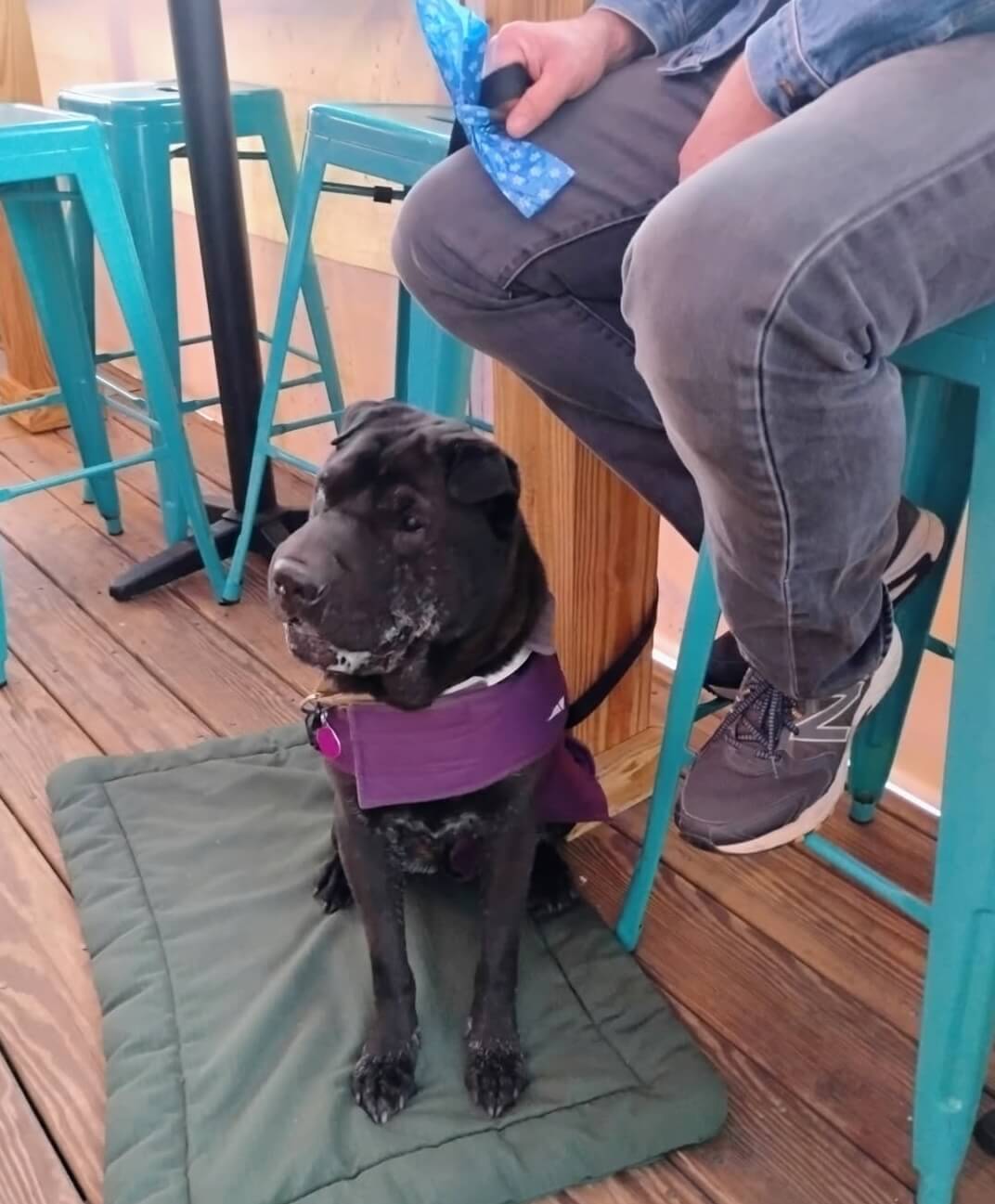 Bugsy is 10 years old, but that doesn’t stop him from enjoying walks and going places with his foster family.